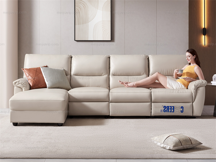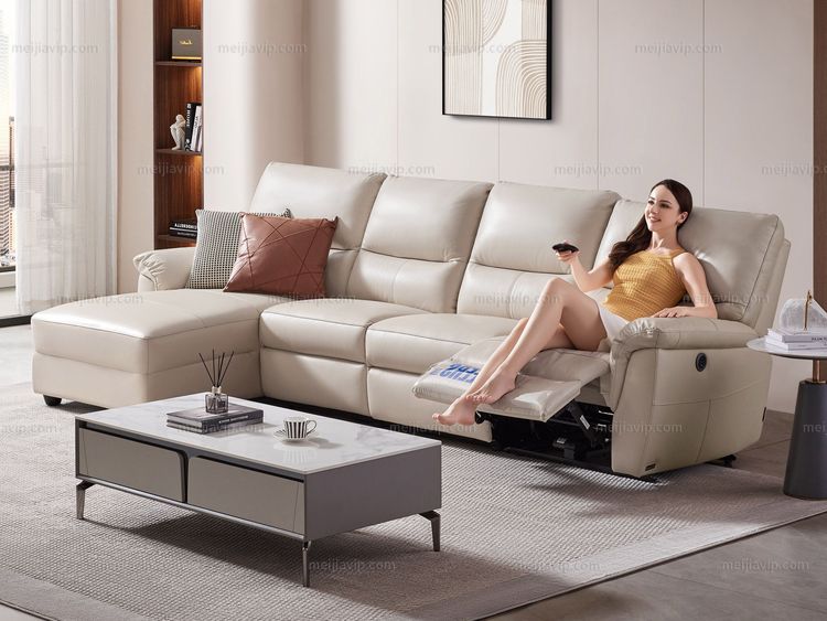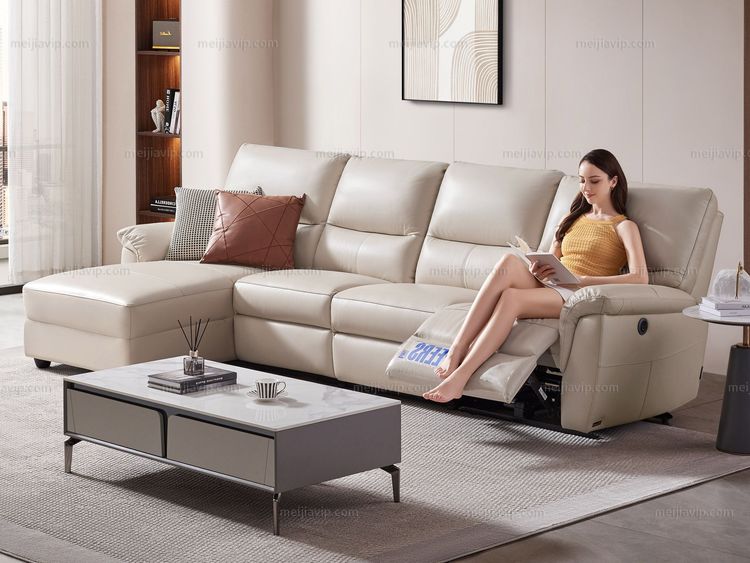 【5280】芝华仕 旗舰款 现代简约巴西进口头层牛皮智能电动多功能象牙白真皮转角沙发 反向曲尺(电动可躺)(1+3+右贵妃)(此款不含抱)(此产品有短途物流费)