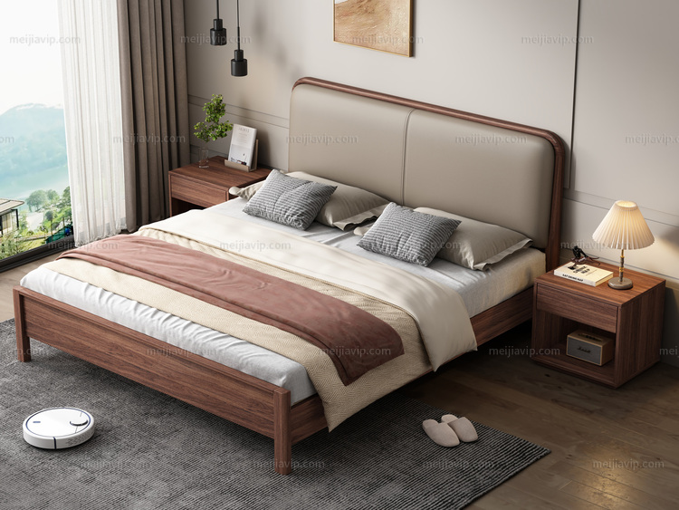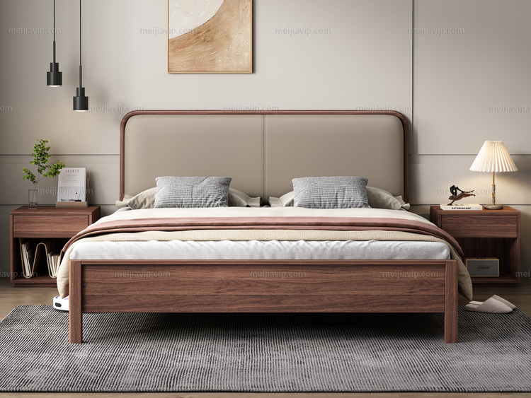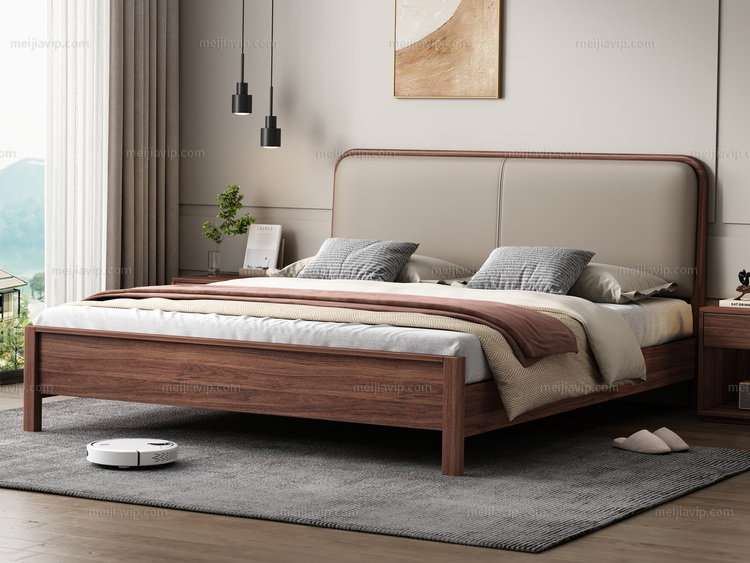 【1180】布木恋语 日式北欧风格 进口黑胡桃木 亲肤细腻仿真皮 高回弹海绵填充靠包 1.82.0米床(天然实木家具、纹理自然随机)
