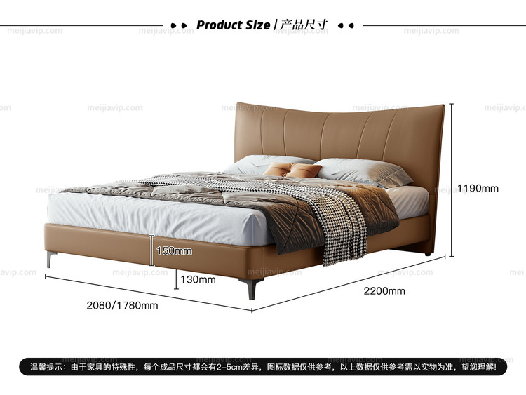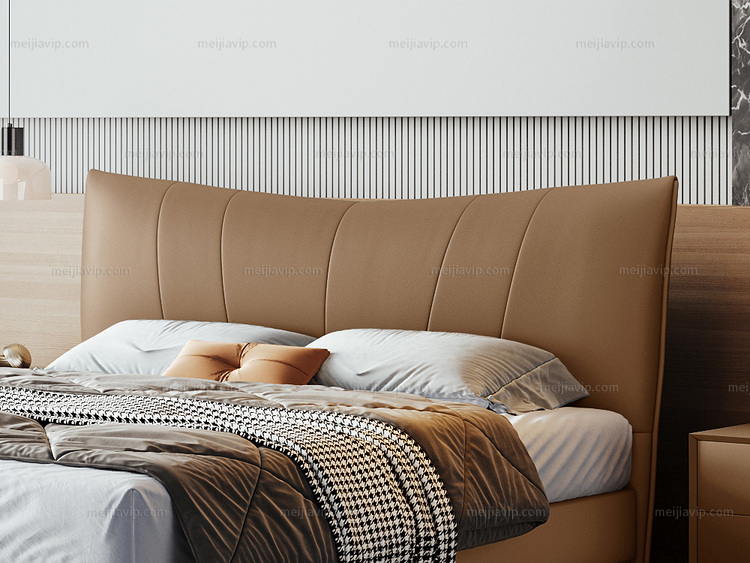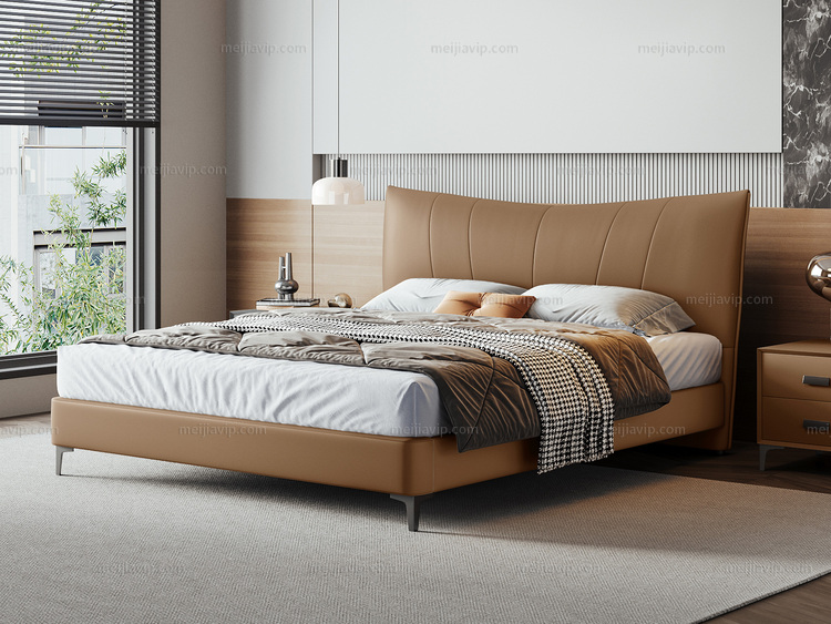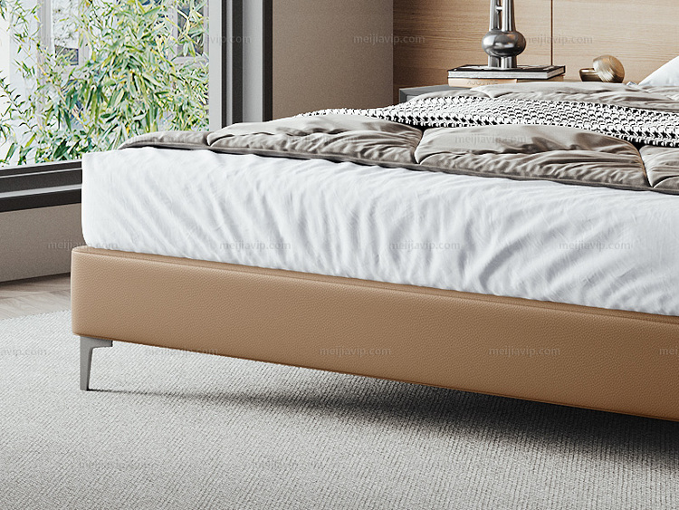 【1199】歌迪 极简风格 高定头层黄牛皮 利落线条一体式挺括靠包 柔韧回弹高密度海绵 俄罗斯进口落叶松实木框架 椰棕色 1.82.0米 床(搭配10公分松木排骨架)