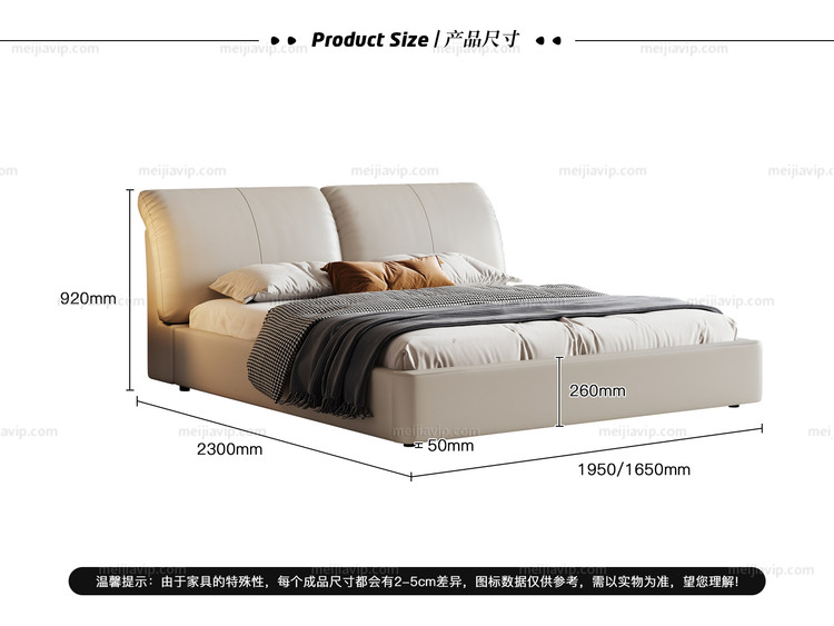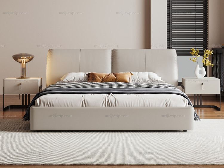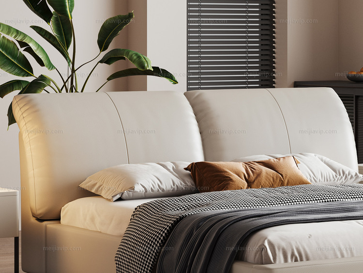 【1299】歌迪 极简风格 高定头层黄牛皮 柔韧细腻 大面积真皮包裹 蓬松饱满羽绒+Q弹柔软海绵 独立双靠包弯曲弧度分段式受力 杏仁白 1.82.0米 真皮床(搭配10公分松木排骨架)