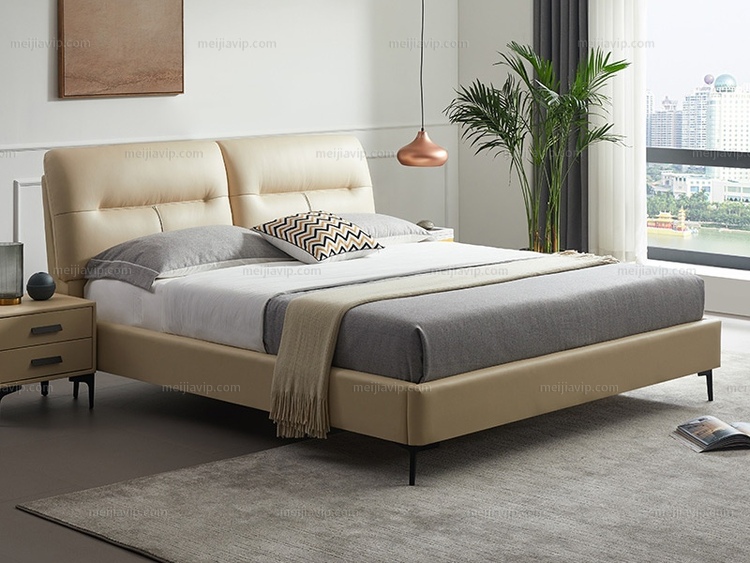 【1499】左右沙发 极简风格 真皮软床 头层牛皮+抗压支撑高密海绵+实木框架 互不干扰分段式双靠包设计 蓬松柔软绵柔触感 齐边设计节省空间 米黄色 常规款 1.82.0米床