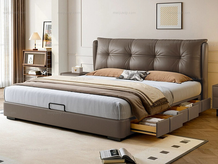 【1550】欧瑞仕 极简风格 高定头层黄牛皮 全实木抽屉 宽大饱满有型高靠包 床侧多功能储物三抽 收纳力Max 右抽屉款 1.82.0米床(搭配10公分松木排骨架)(面向床抽屉在右)
