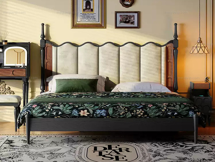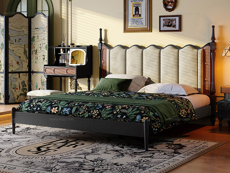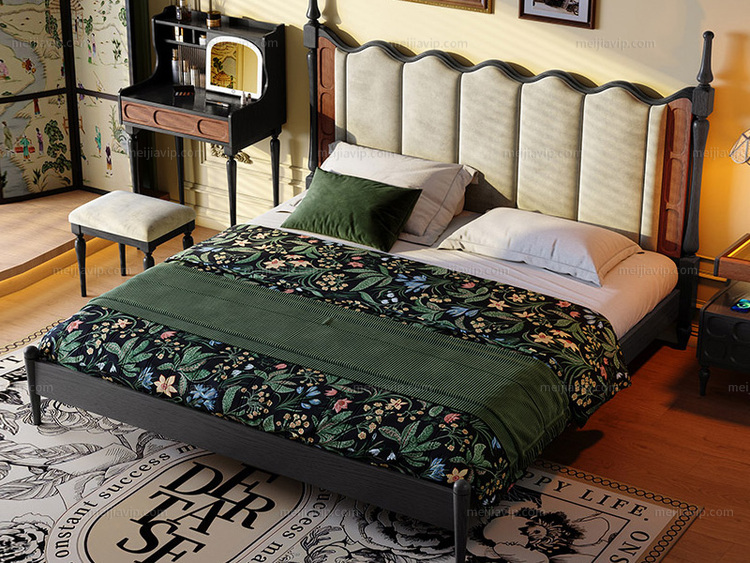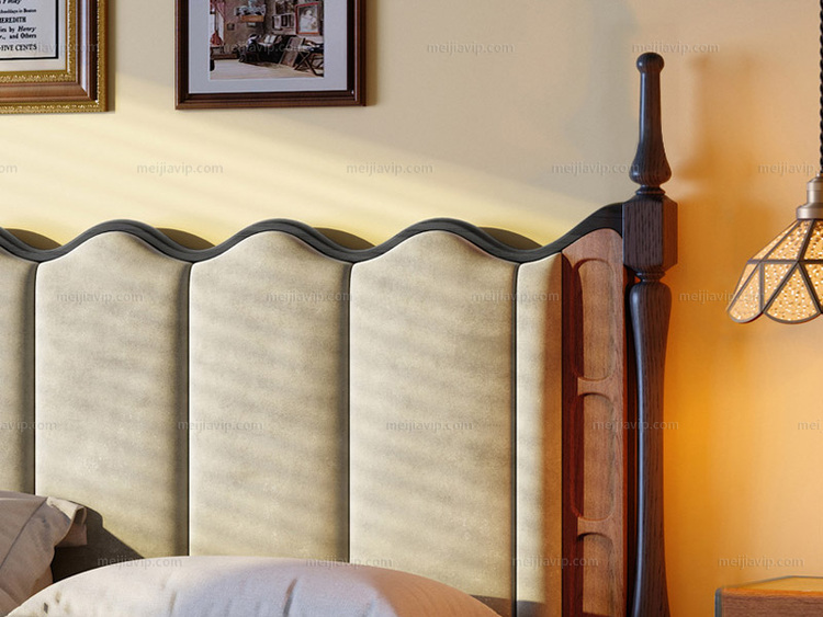 【1590】伽罗时光 中古风 海浪实木床 北美进口白蜡木 亲肤透气磨砂布 波浪型高靠背倚靠舒适 云端高密度海绵松软回弹 罗马柱对称立柱造型 加高立耳侧柱随心置物 纯色 1.82.0米 实木床